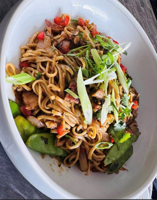 Finely slice chicken thighs and season with taste buds Caribbean Jerk and fry with 1tsp olive oil, Whilst that cooks get on with the rest